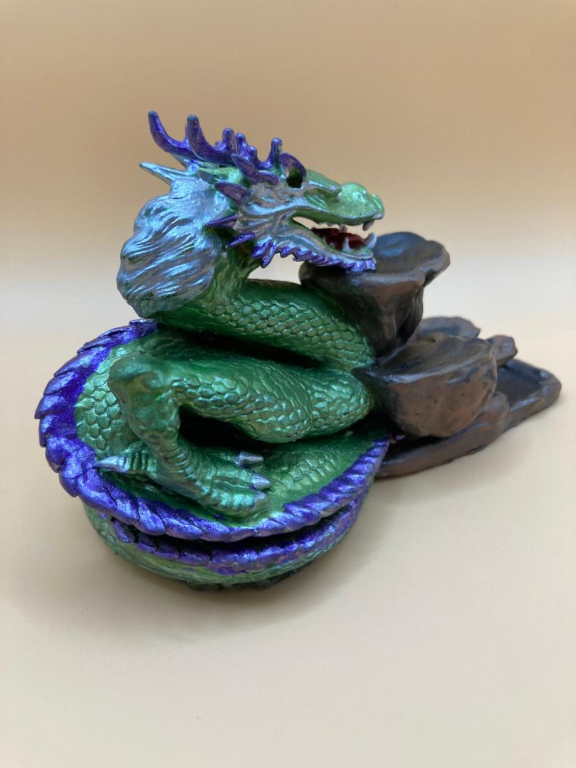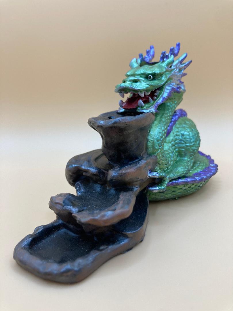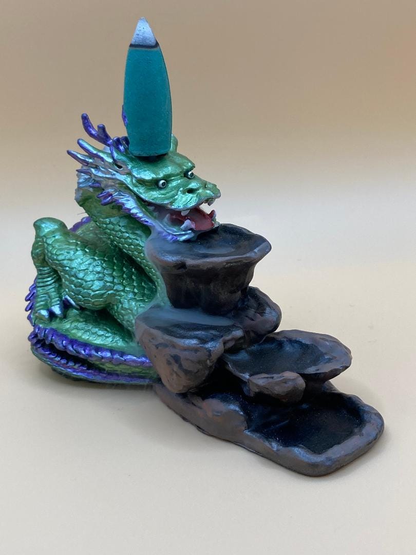 Backflow Dragon Incense Cone Holder. Backflow smoke runs through the Dragon's mouth and down each top of the rocks. Three Dhoop cones are included (Sage Scented). This item has been 3d printed, then hand painted with acrylic paints with a gloss sealer. Upon request the buyer can ask for a reprint choosing any color choices and the size of making it a bigger size or in some cases smaller. Contact for more information for this option.