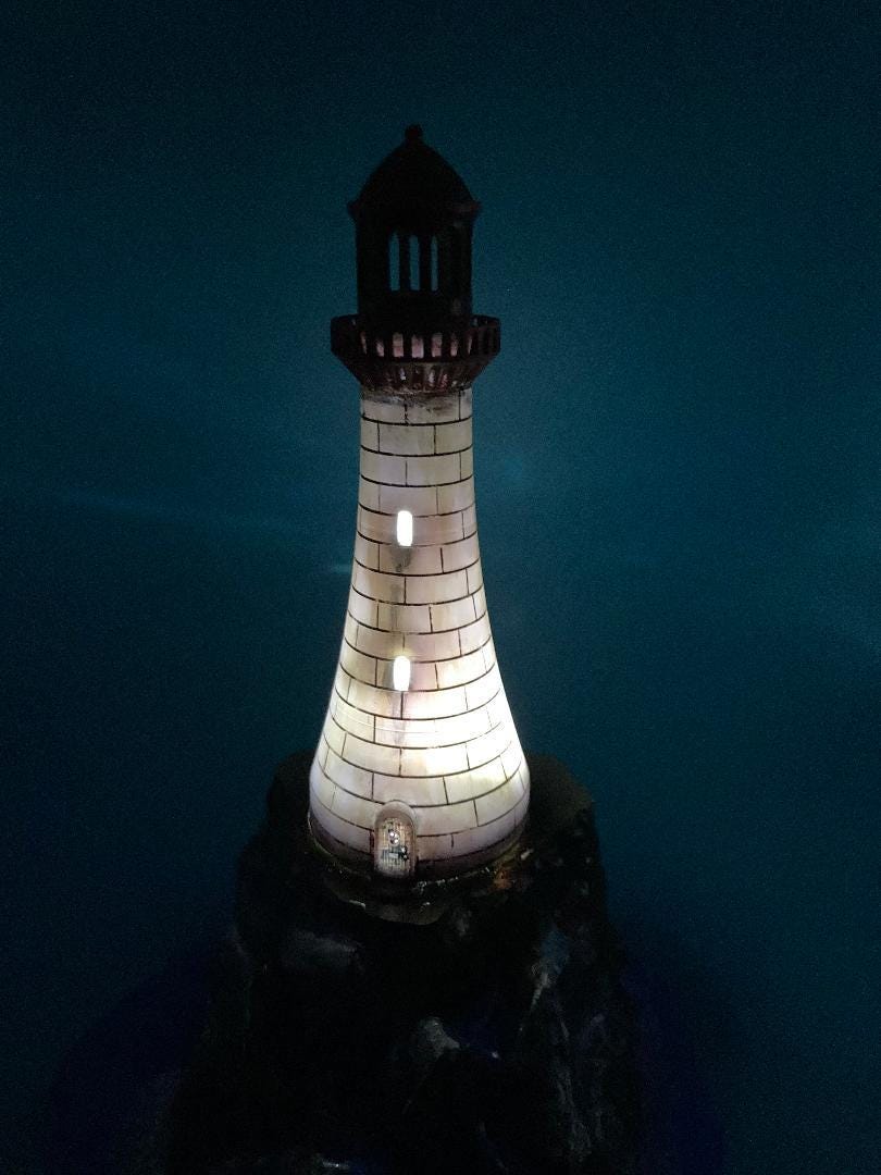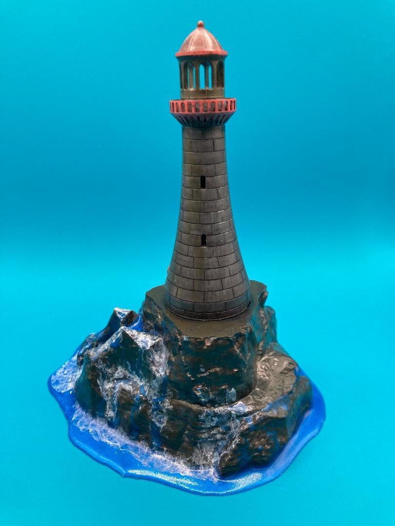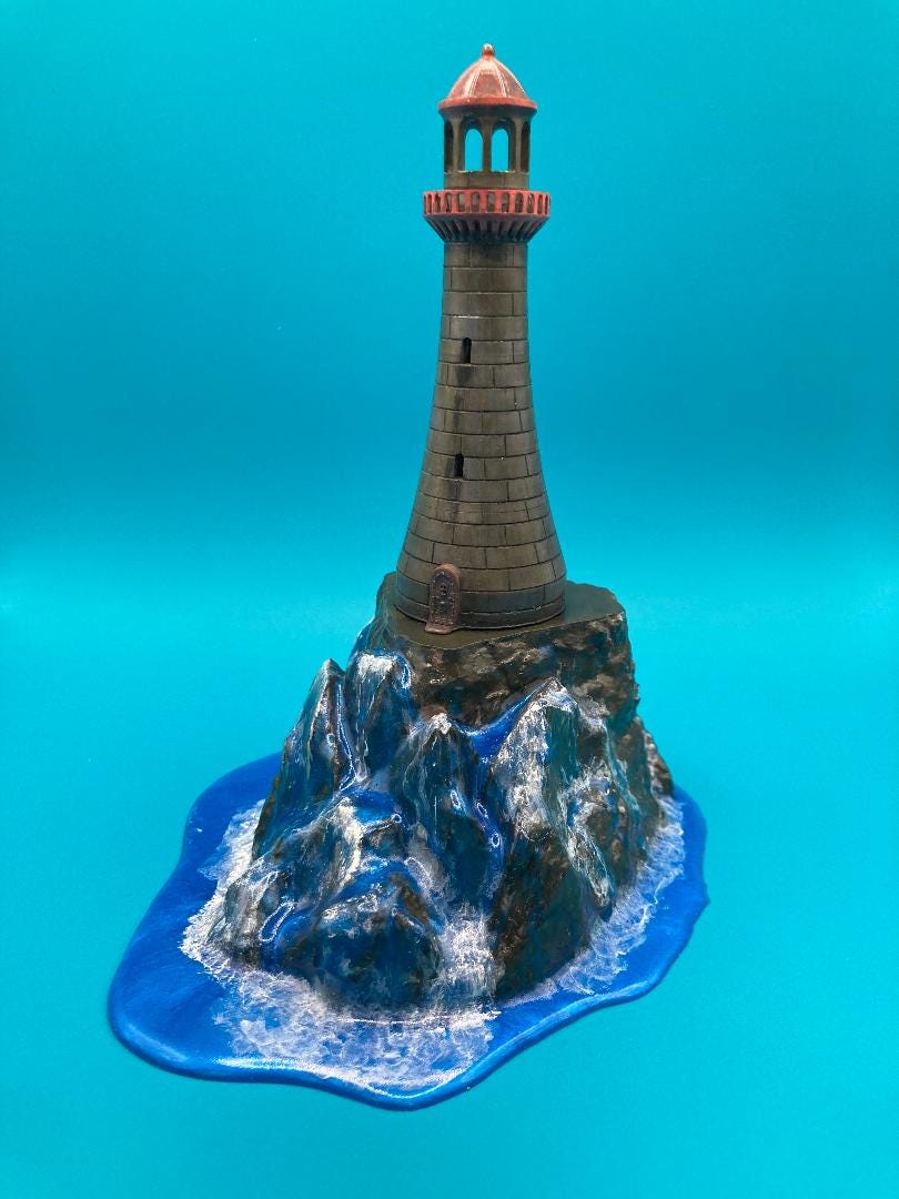 3d printed Lighthouse on the rocks. We used Epoxy Resin highlighting the water effects from waves. The light lighthouse has an LED tealight that makes a great glow in the dark. One of a kind piece. Upon request of the shopper this we can reprint for a bigger or even smaller size. Just contact for more information and any questions you mat have.